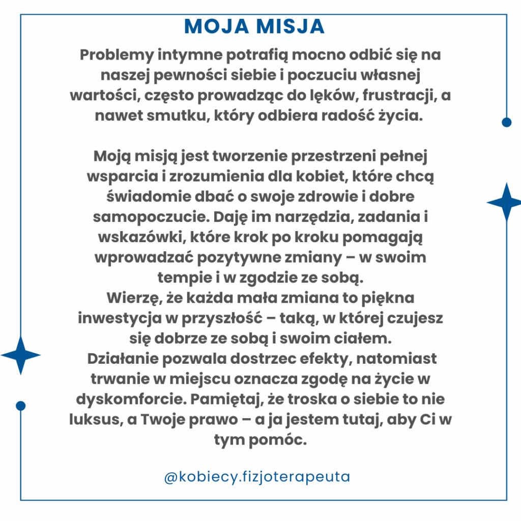 Uwielbiam dzielić się wiedzą, dlatego prowadzę warsztaty zdrowia intymnego, a także tworzę przestrzeń edukacyjną – piszę bloga, nagrywam podcasty i regularnie publikuję inspirujące treści na Instagramie. Znajdziesz mnie tam pod nazwą kobiecy.fizjoterapeuta, gdzie rozmawiamy o zdrowiu, kobiecości i dobrym samopoczuciu.
